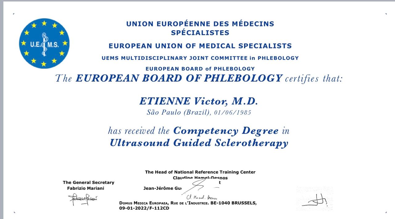 Poseo dos másteres europeos en Flebología y Tratamientos endovenosos termicos y no termicos, acreditados por la UEMS (Unión Europea de Médicos Especialistas).