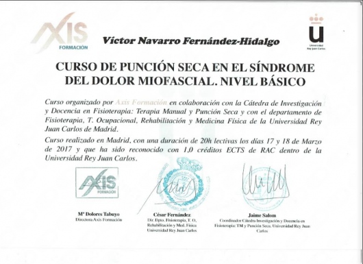 ¿Cuáles son las principales especialidades de Victor Navarro Fernandez-Hidalgo?Victor Navarro Fernandez-Hidalgo es fisioterapeuta. Te mostramos algunos de los servicios que ofrece gracias a su trayectoria y amplia experiencia: Visita Fisioterapia, Punción seca, Osteopatía, Terapia manual de la ATM, Inmovilización de fracturas y/o luxaciones de pierna, tobillo y pie, Tratamiento para dolor de hombro, Tratamiento de fascitis plantar, Tratamiento para dolor de espalda, Tratamiento para lumbalgia, Ecografía muscular o tendinosa.