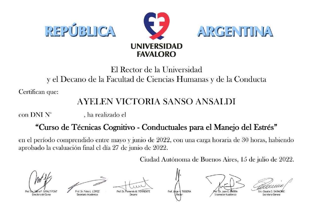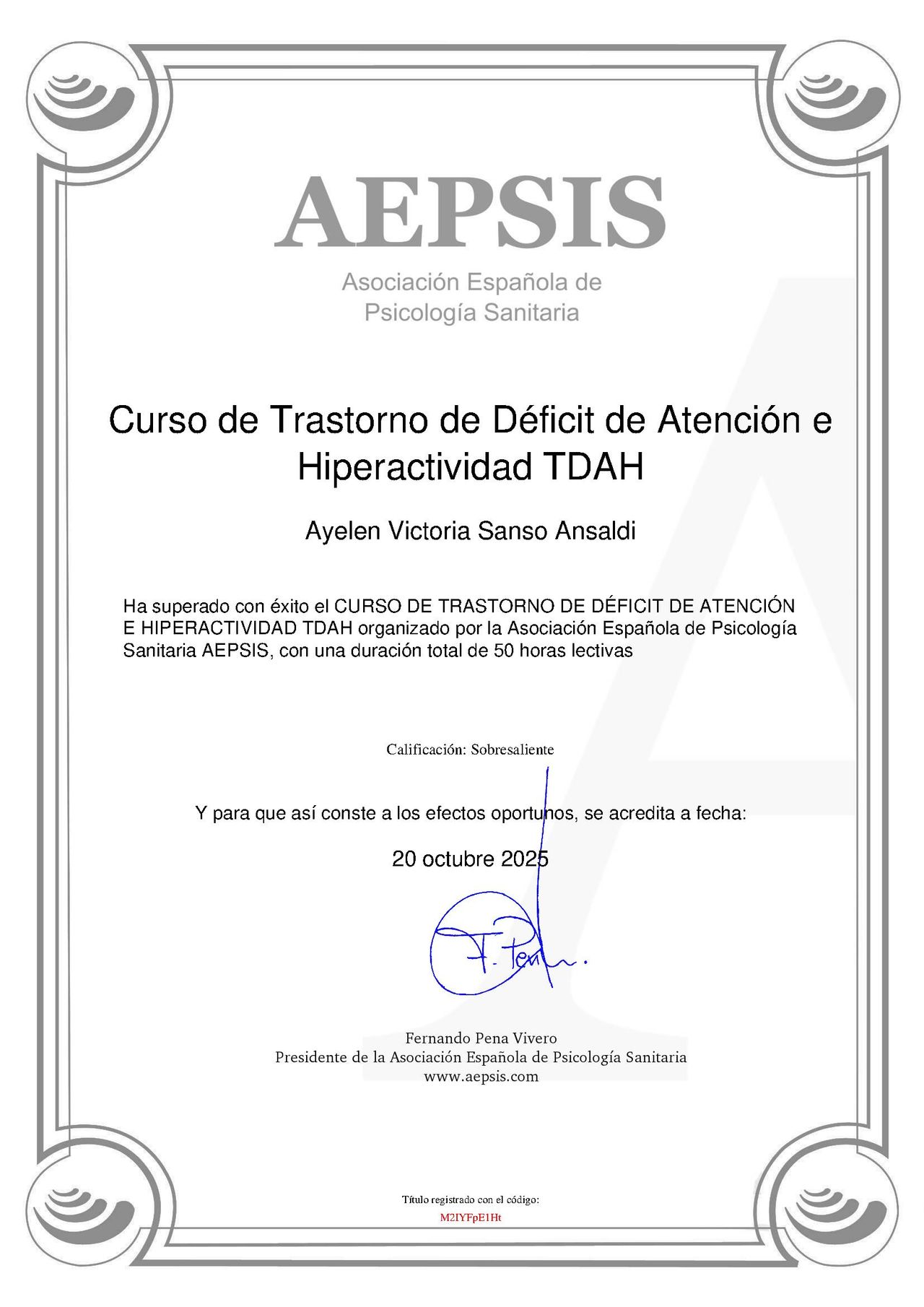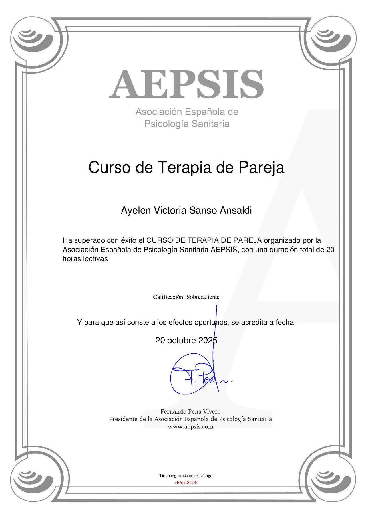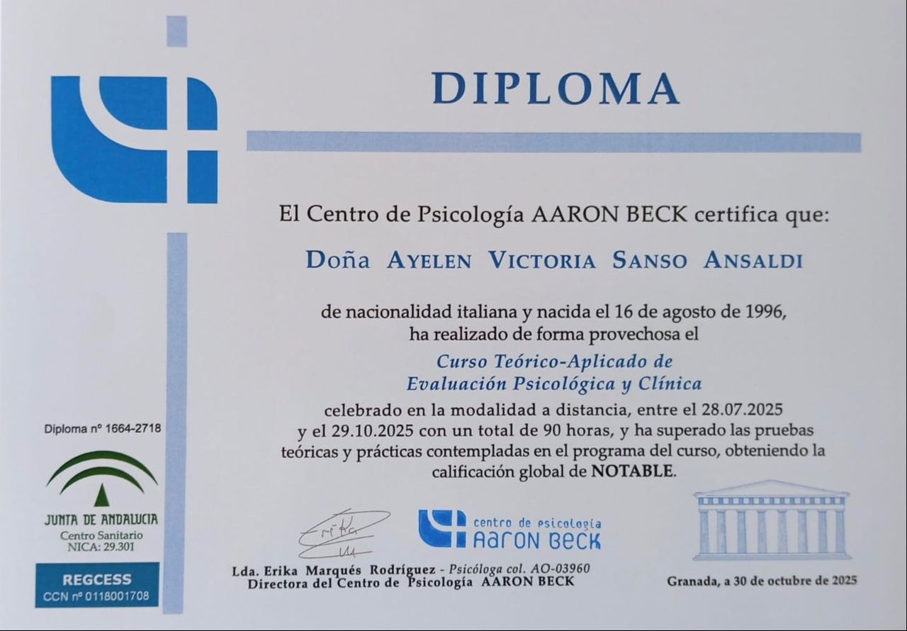 Mi nombre es Ayelen Victoria, Psicóloga General Sanitaria (COPCV 19739), especializada en la evaluación, diagnóstico e intervención psicológica en adultos y adultos mayores.
