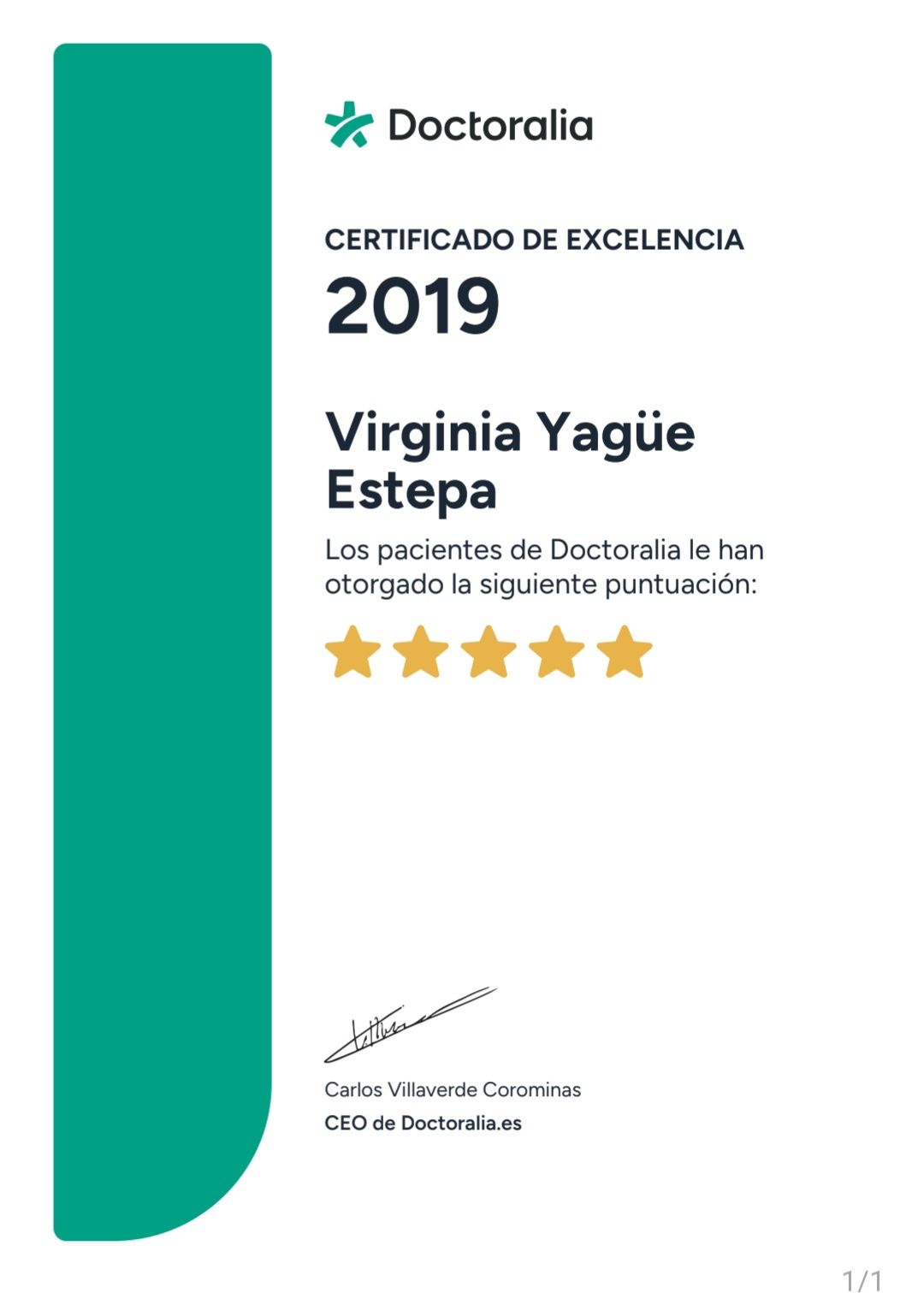 ¿Qué opinan los pacientes de Virginia Yagüe Estepa?Un total de 61 pacientes han querido dejar una opinión sincera y real sobre Virginia Yagüe Estepa, otorgándole además una valoración media de 5 estrellas (sobre un máximo de 5).