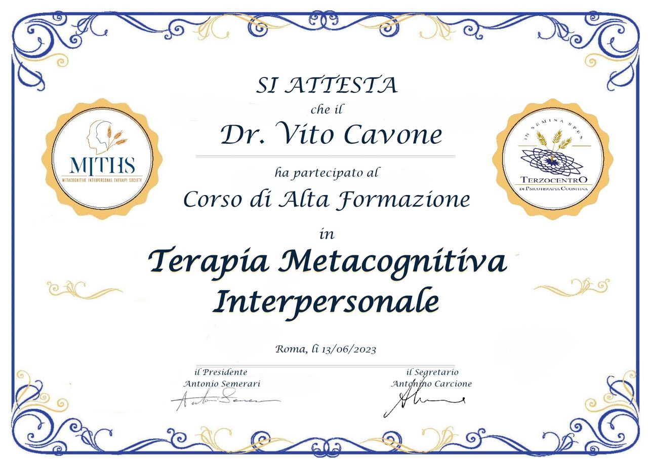 Durante los años de residencia en Italia, he acudido a un máster en psicoterapia cognitiva de tercera generación, que me ha permitido cumplimentar e integrar mi formación médico-psiquiátrica.