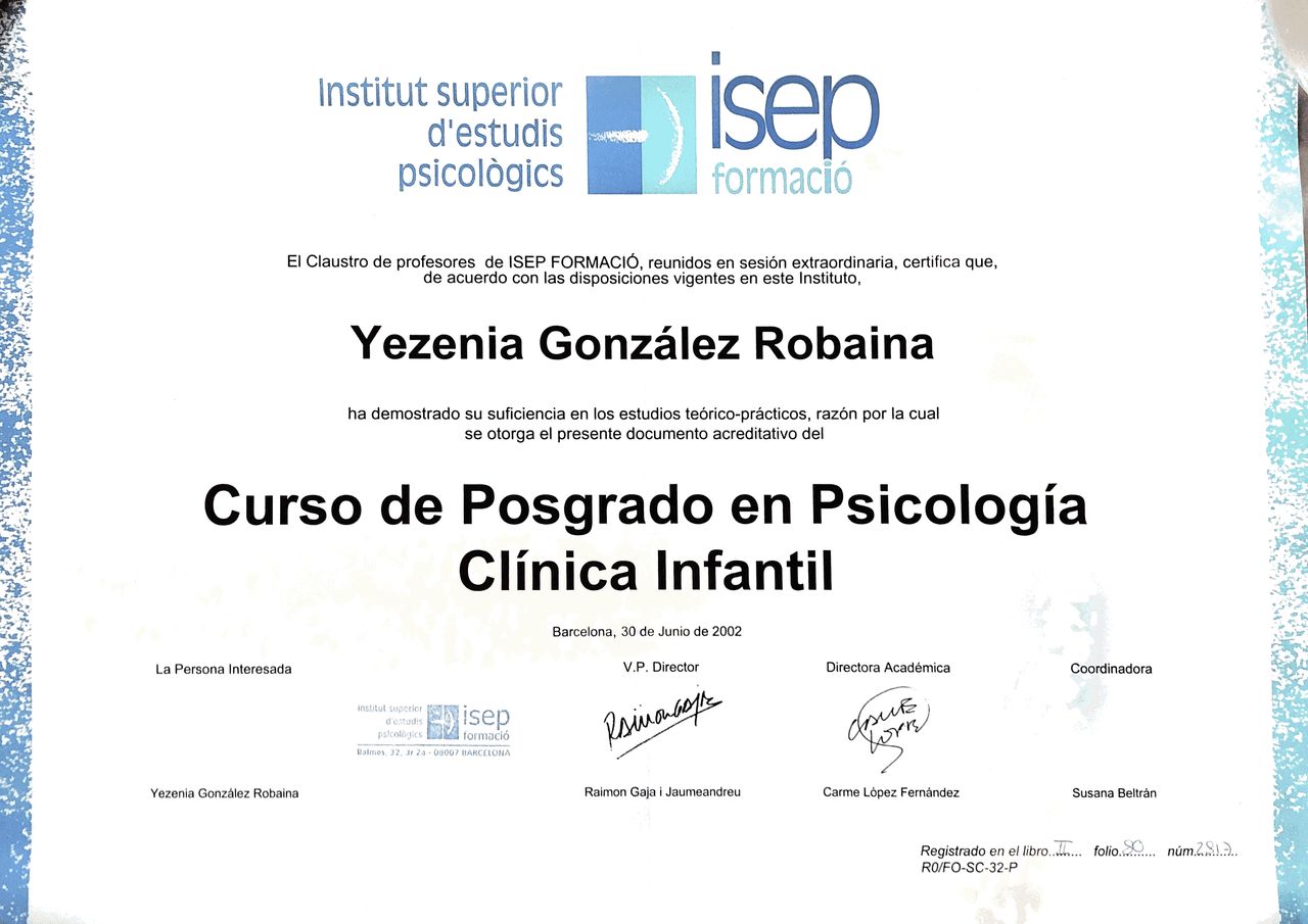 -Postgrado en Psicología Clínica Infantil, Instituto Superior de Estudios Psicológicos de Barcelona.