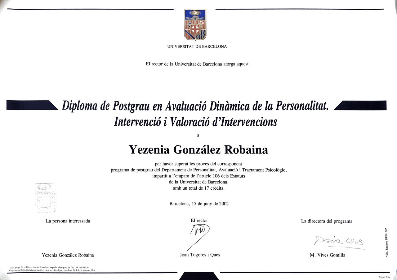 -Postgrado en Evaluación Dinámica de la Personalidad, Intervención y Valoración de Intervenciones, Universidad de Barcelona.