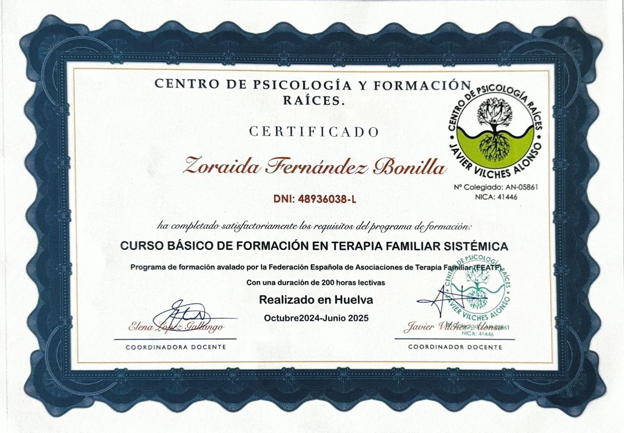 Soy Zoraida Fernández , Psicóloga General Sanitaria, especializada en terapia individual, familiar y de pareja. Trabajo desde un enfoque integrador y basado en la evidencia científica, utilizando modelos terapéuticos como la Terapia EMDR, la Terapia Sistémica Familiar y la Terapia Cognitivo-Conductual, entre otros.