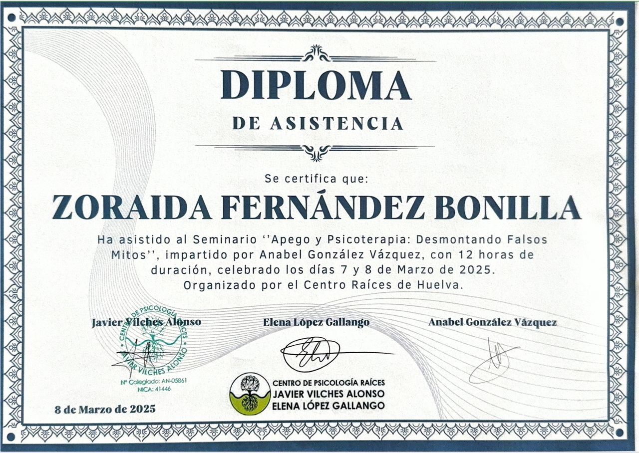 Zoraida es una gran profesional, comprometida con su trabajo y muy cercana. Me está acompañando, guiando y ayudando en un proceso en el que debería haber empezado hace mucho. Estoy encantada con ella, me está ayudando bastante a poner mi vida en orden. La recomiendo sin lugar a dudas. Es una maravillosa profesional. Gracias por la dedicación.